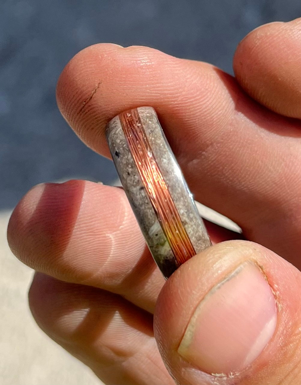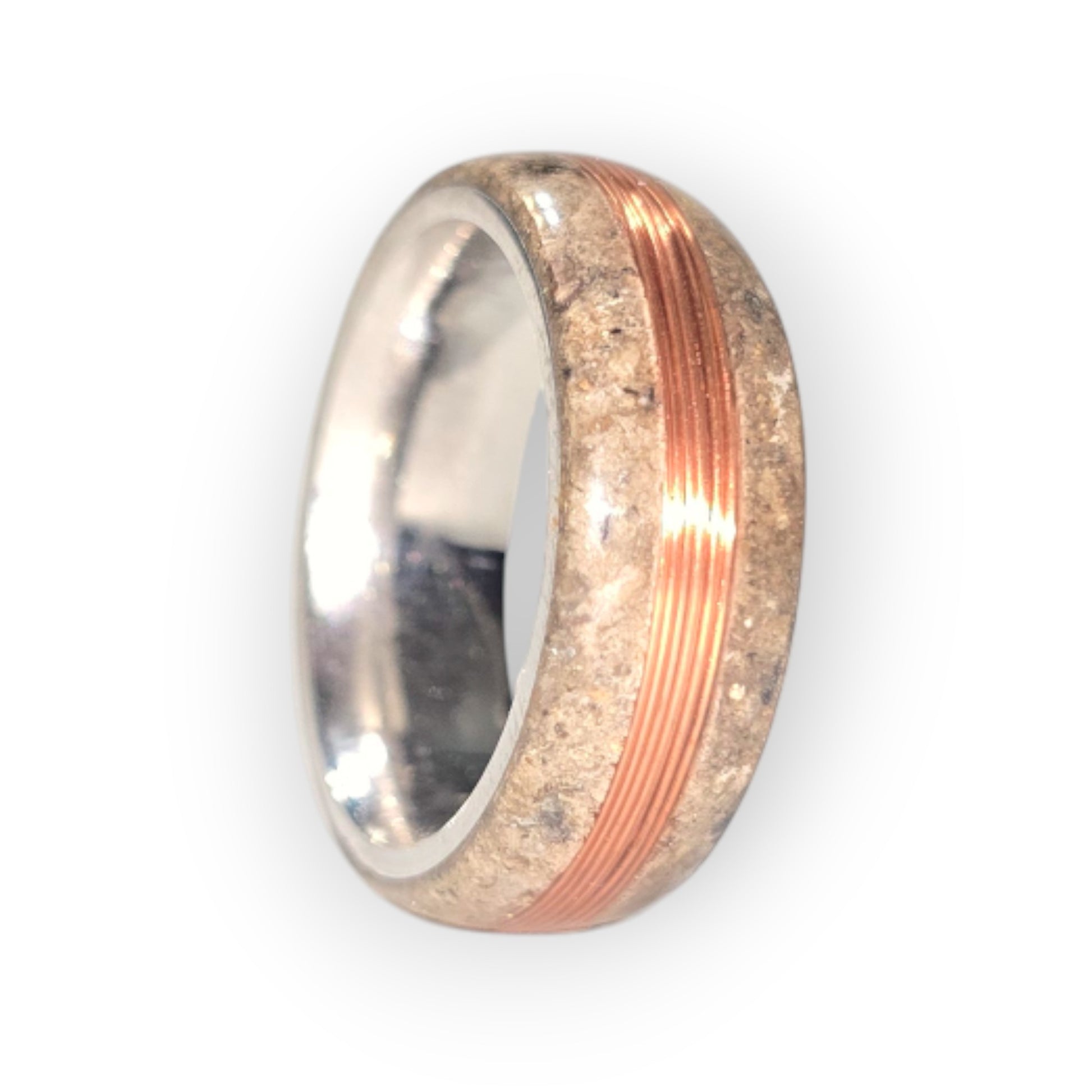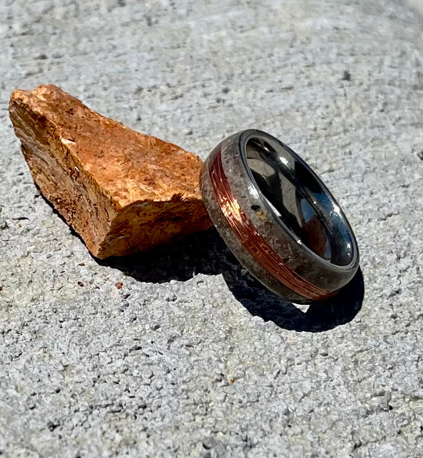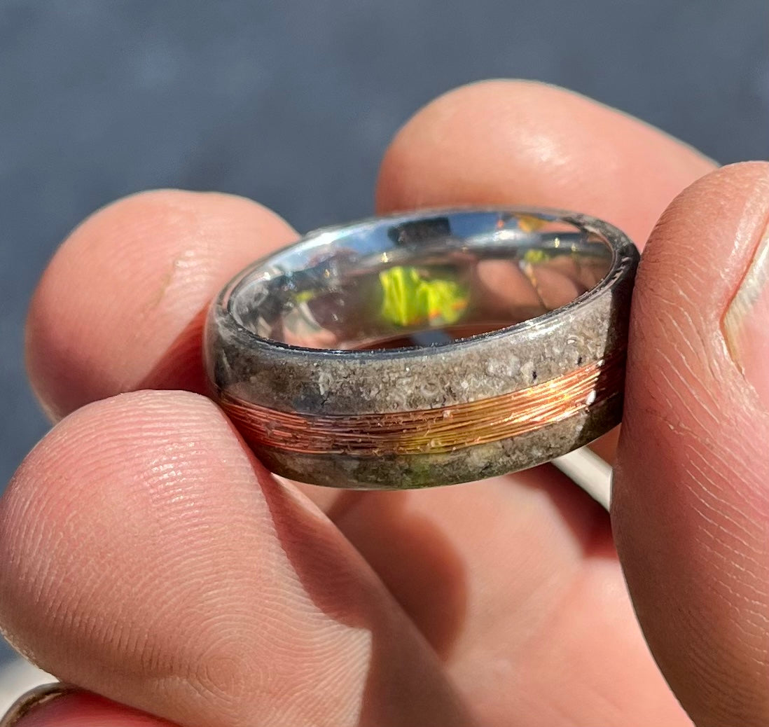 The Electrician is a one-of-a-kind ring forged from oak tree ashes and wrapped with copper wire at its core. Oak symbolizes strength and wisdom, while copper is known for its protective and conductive properties—making this ring a tribute to resilience, energy, and purpose.