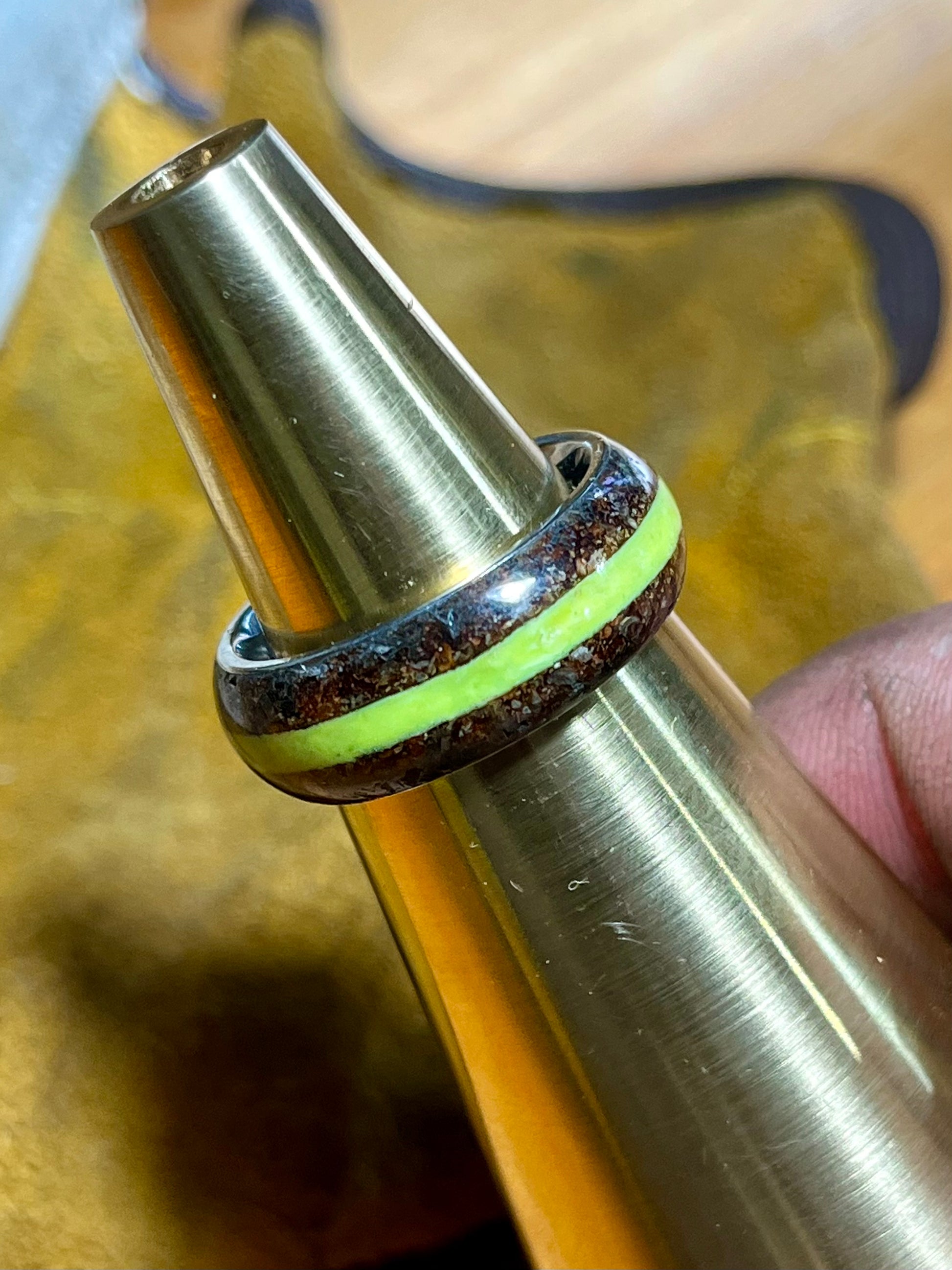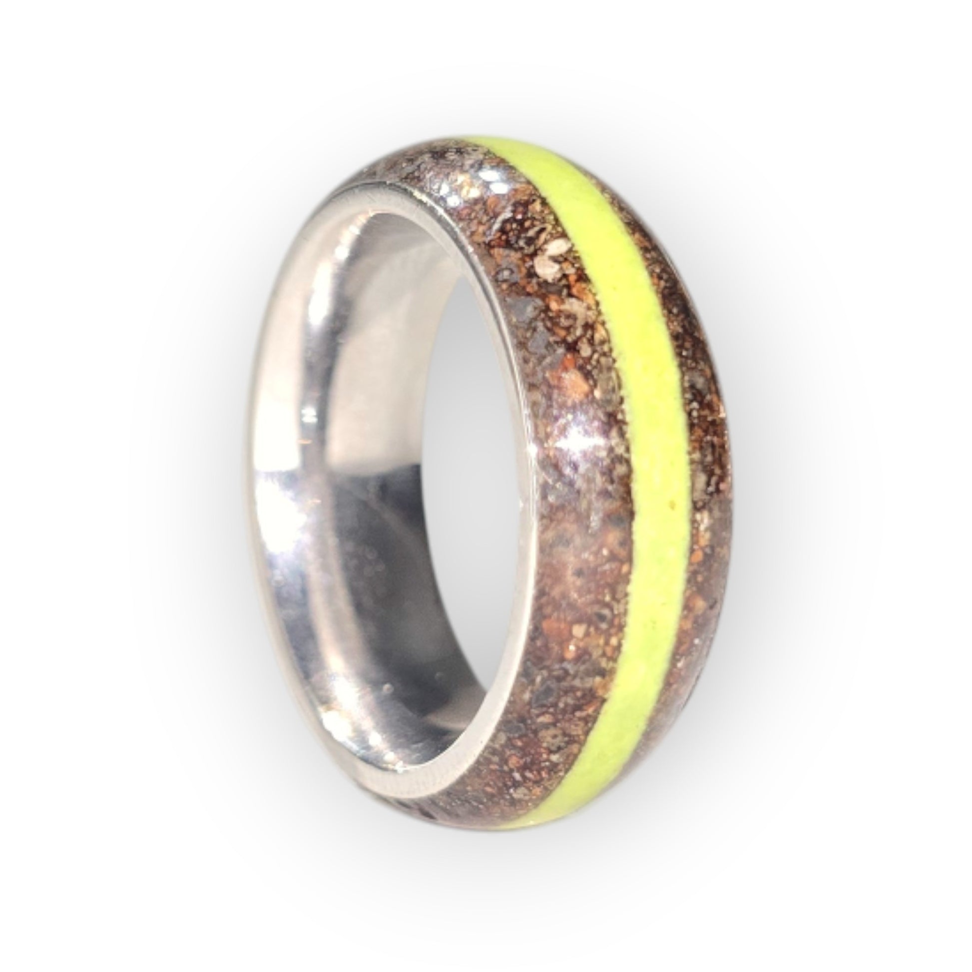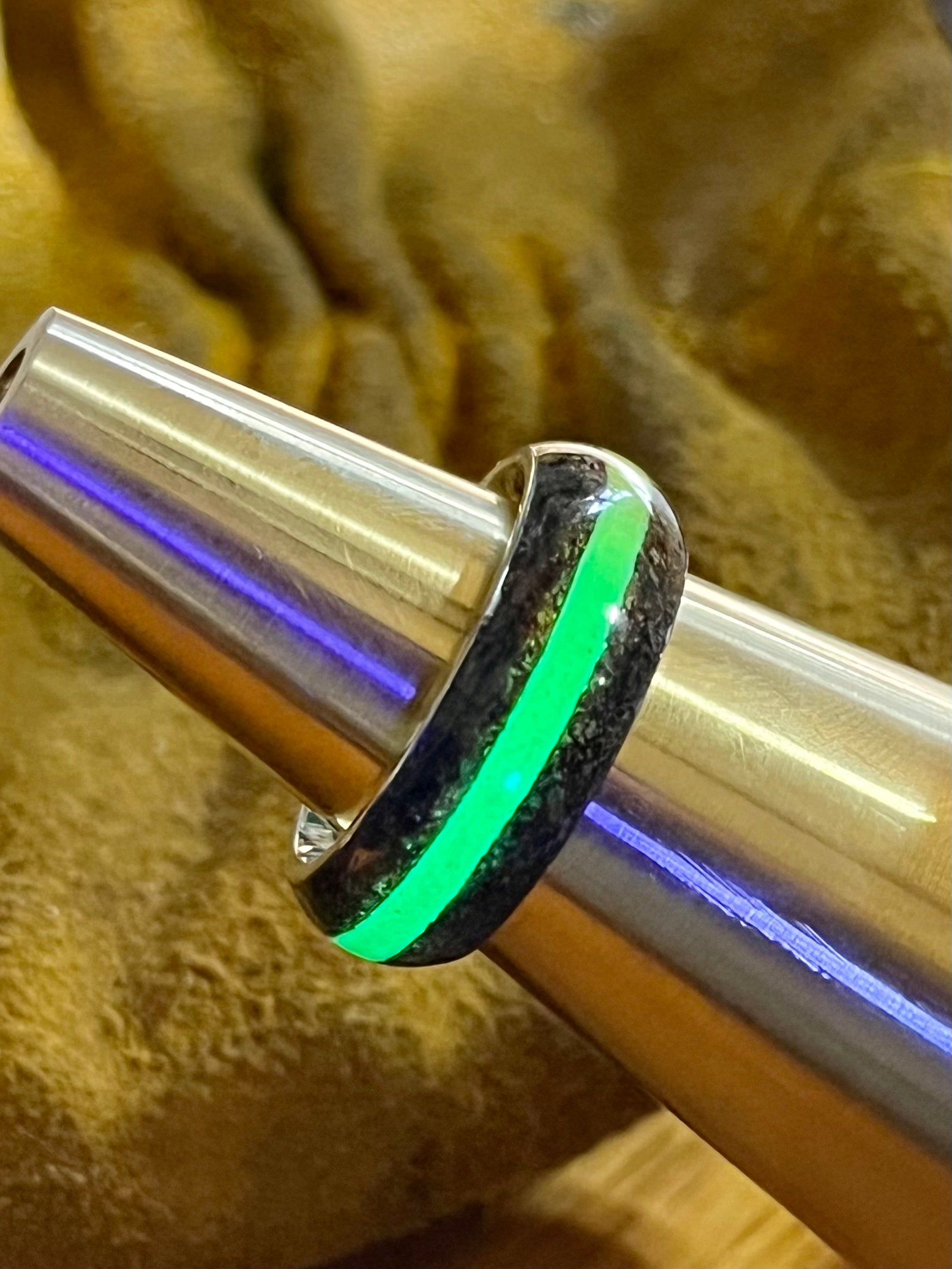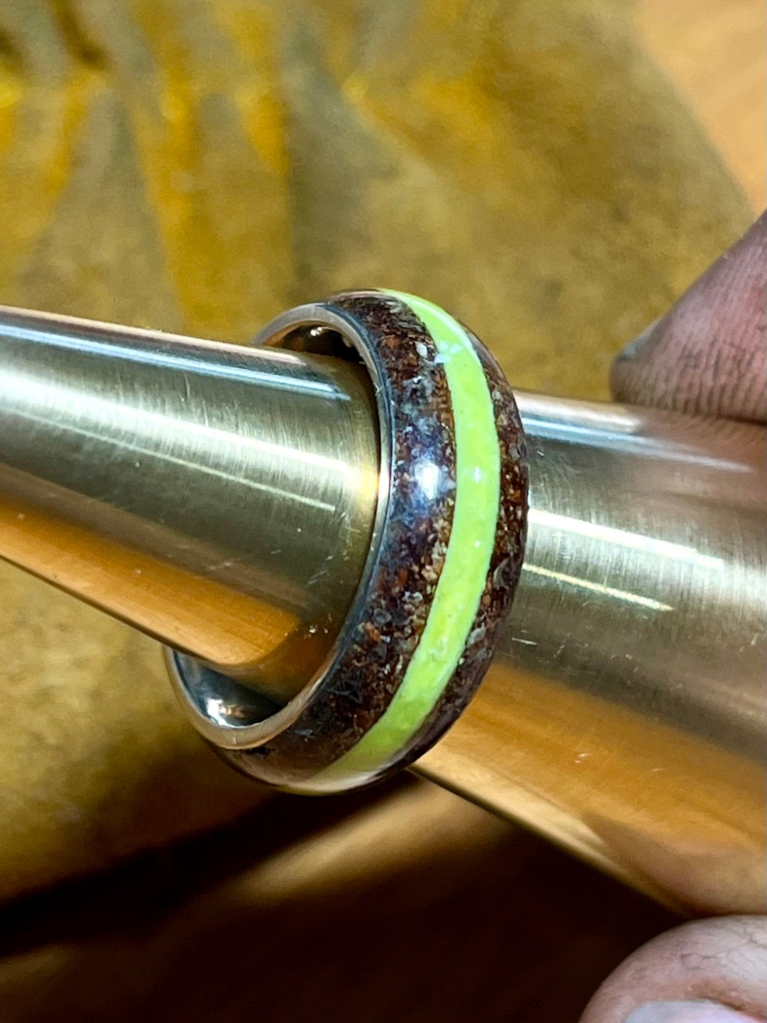The Night Roast is a handcrafted ring made from fresh ground coffee and a glowing yellow-green center that comes alive in the dark. The rich, textured coffee inlay brings warm, earthy tones and subtle aroma, while the glow-in-the-dark core adds a bold, unexpected twist. Set in a durable stainless steel band, this ring is a fusion of comfort, creativity, and curiosity — perfect for those who love their style with a shot of personality and a spark of light.