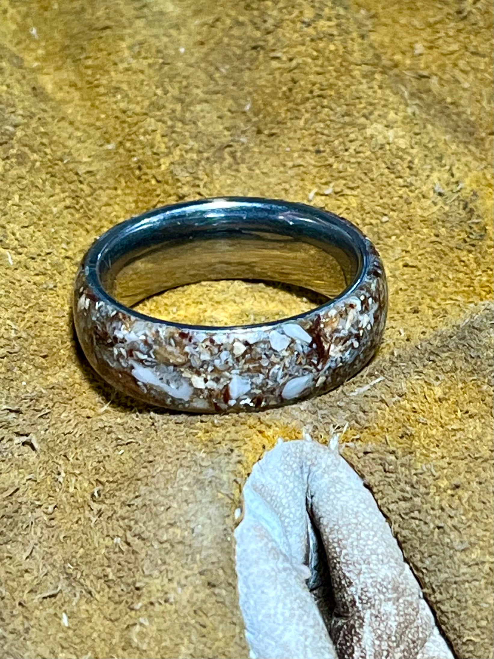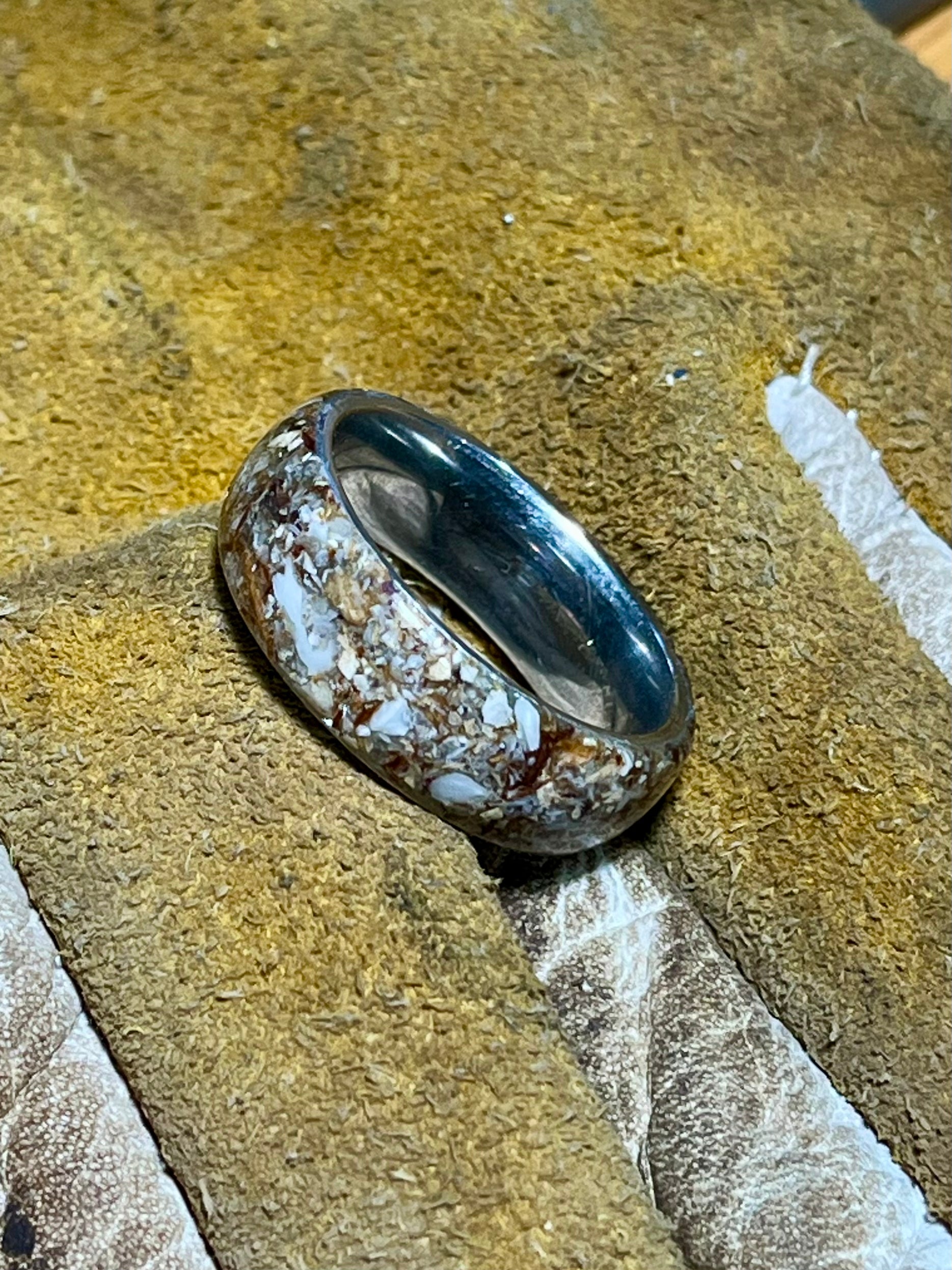 The River Rat is a wild tribute to nature’s raw elements — handcrafted from crushed river rock, driftwood shavings, and finely processed fish bone. Each piece captures the rugged spirit of river life, blending earthy textures and organic detail into a durable stainless steel band. With its mosaic of stone, wood, and bone, this ring is a bold statement of resilience, adventure, and untamed beauty — perfect for those who live close to the water and even closer to the edge.