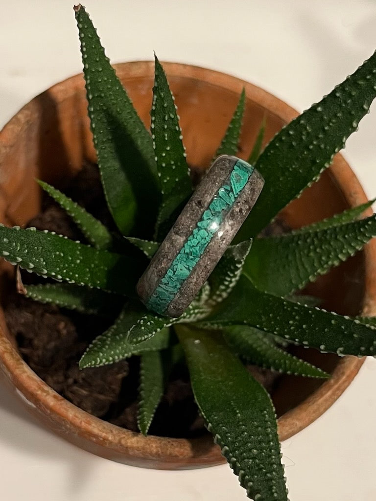 The Sentinel is a stainless steel ring built to endure, with a hidden chamber that holds cherished ash. At its center, crushed malachite shines — a vivid green stone symbolizing transformation, healing, and connection. Each malachite fragment is unique, just like the memory it honors. This ring is a bold, timeless tribute to a bond that lives on beyond this life.