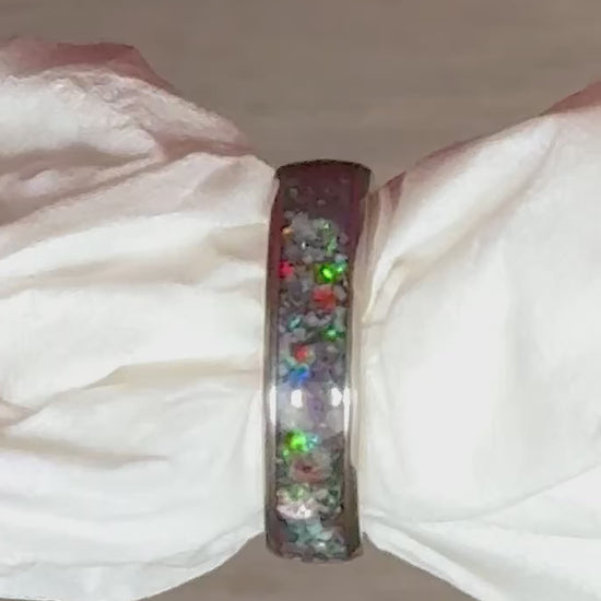 Introducing the "Trash Ring," a unique statement piece crafted from a mesmerizing mosaic of crushed opals, obsidians, mother of pearl, and a medley of other exquisite stones. Each ring is a one-of-a-kind work of art, where salvaged remnants find new life in a dazzling display of color and texture.